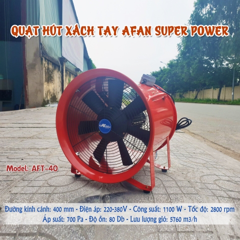 Thông số quạt hút xách tay Afan AFT-40 có dòng điện là 220V (1 phase) hoặc 380V (3 phase) – cho khách hàng dễ dàng lựa chọn